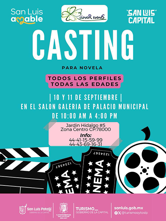 El casting se llevará a cabo los días 10 y 11 de septiembre, en un horario de 10:00 de la mañana a 4:00 de la tarde, en las instalaciones del Palacio Municipal, ubicadas en Jardín Hidalgo #5, Zona Centro y, los interesados podrán obtener más información y resolver dudas a través de los números telefónicos 444-115-5999 y 444-369-1631.