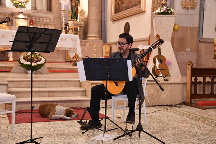 Durante la presentación, las luces de las velas acompañaron las arias y piezas interpretadas por los concertistas Esmeralda Barrientos, Martha Mata y Santiago Buell Pesci, del Instituto Potosino de Bellas Artes, en una atmósfera que conmovió incluso a “Ruffo”, un perrito que se sumó silenciosamente a la audiencia desde el altar.