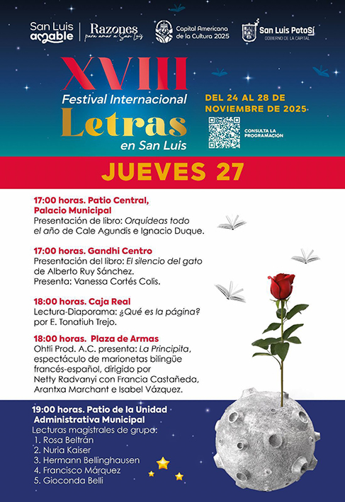 San Luis Potosí, SLP.- El Gobierno Municipal a través de la Dirección de Cultura Municipal, invita a la ciudadanía a disfrutar de la programación del cuarto día del XVIII Festival Internacional Letras en San Luis, un evento que continúa posicionando a la capital como un referente literario y artístico.