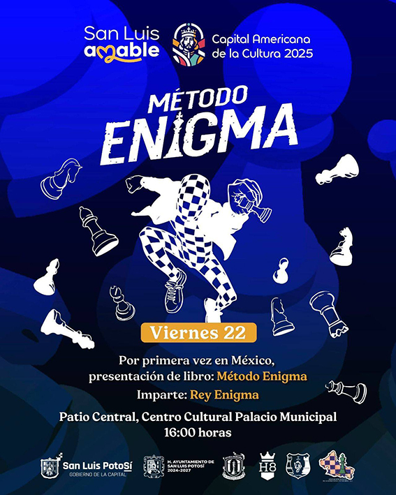 Así lo dio a conocer Héctor Ulises Tello Balderas, encargado de la Dirección de Cultura Municipal, quien dijo que las actividades con Rey Enigma comienzan desde el 22 de agosto a las 16 horas con la presentación del libro: “Método Enigma”, y posteriormente “Simultánea de 24 jugadores con Rey Enigma”. Ambas actividades en Palacio Municipal.