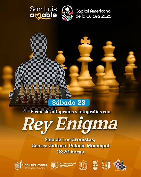 San Luis Potosí, SLP.- El Gobierno de la Capital a través de la Dirección de Cultura Municipal hace una atenta invitación al público que gusta del ajedrez para conocer las actividades del II Torneo Municipal de Ajedrez “Daniel de La Llera”, que tendrá verificativo del 22 al 24 de agosto próximos, contando con la presencia del destacado ajedrecista español Rey Enigma.