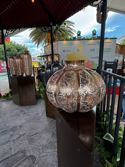 Reconocido recientemente en el Tianguis Turístico de México por su extraordinaria labor en piezas de cobre martillado, Punzo Chávez presenta en San Luis Potosí un trabajo que conjuga tradición, creatividad e innovación, fruto de generaciones de artesanos que han mantenido vivo este patrimonio cultural de México.