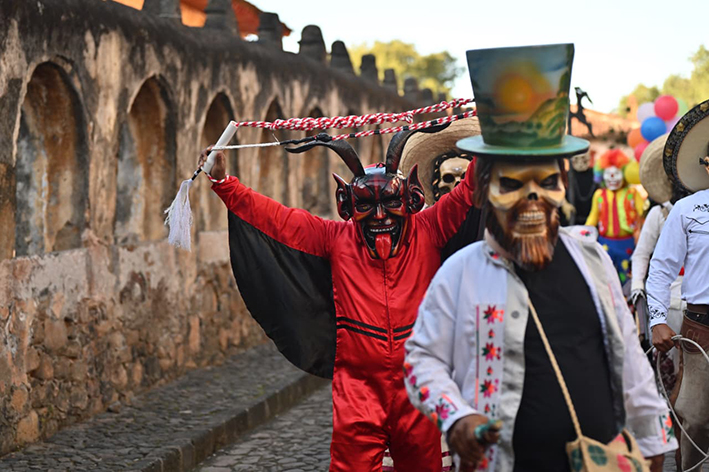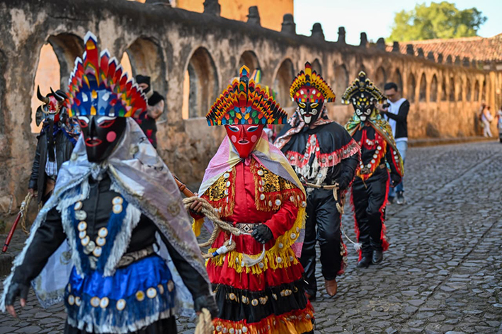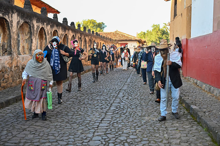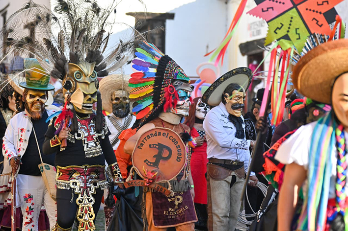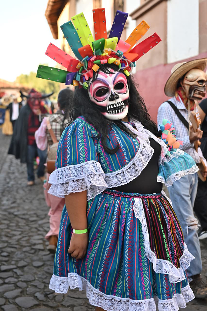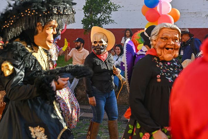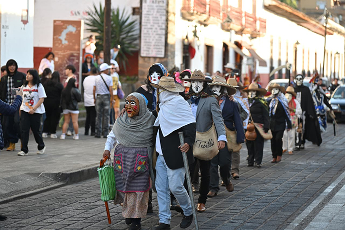 Danzas, máscaras, atuendos típicos y música de viento transformaron el espacio público en una expresión viva del respeto a los que ya no están, pero también en una celebración de la vida misma.