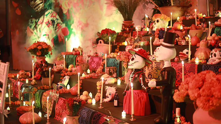 El Palacio de Gobierno se llenó de luz, color y fragancias, con la participación de comparsas tradicionales de la Huasteca y el altar que muestra siete niveles del viaje del alma, representando la travesía espiritual, incluyendo elementos como el agua, la sal, las velas y veladoras, el copal e incienso, las flores de cempasúchil y las calaveras, frutas, pan de muerto, papel picado y fotografías.