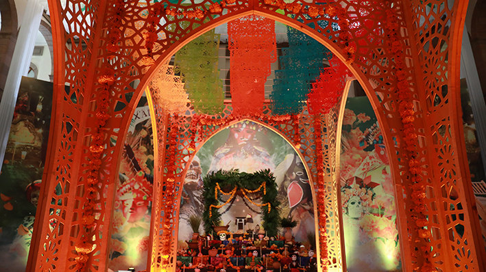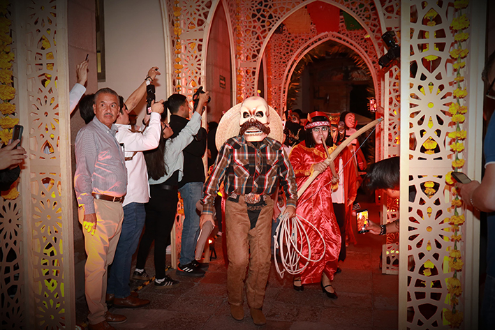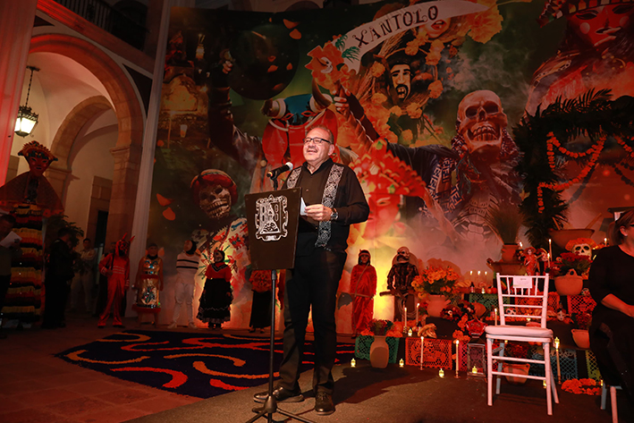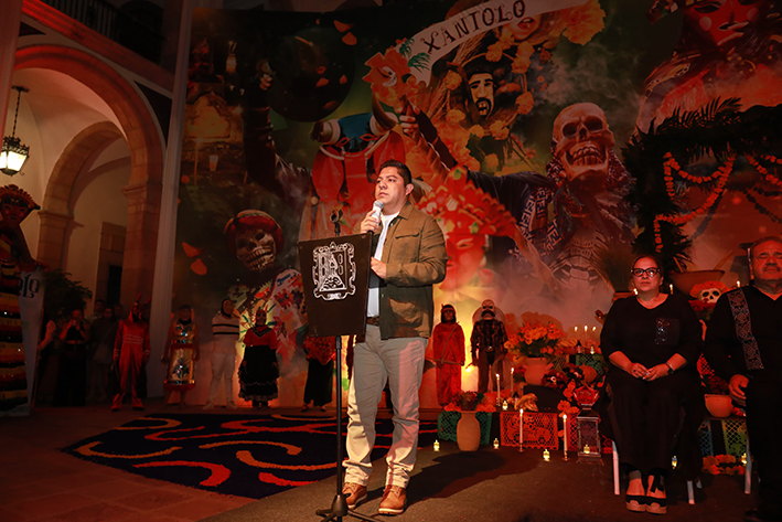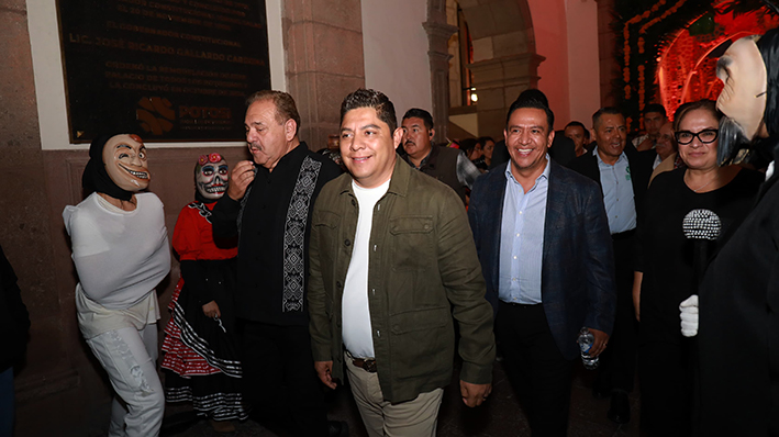 San Luis Potosí, SLP.- Entre los aromas de cempasúchil, copal, pan, comida de la ofrenda y la luz de la velas y veladoras, el Gobernador de San Luis Potosí, Ricardo Gallardo Cardona, inauguró el Altar de Muertos monumental en Palacio de Gobierno, que funde el color y la tradición para rendir homenaje a la vida y la memoria.