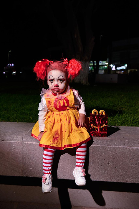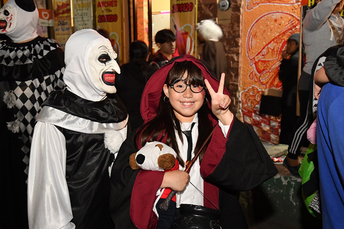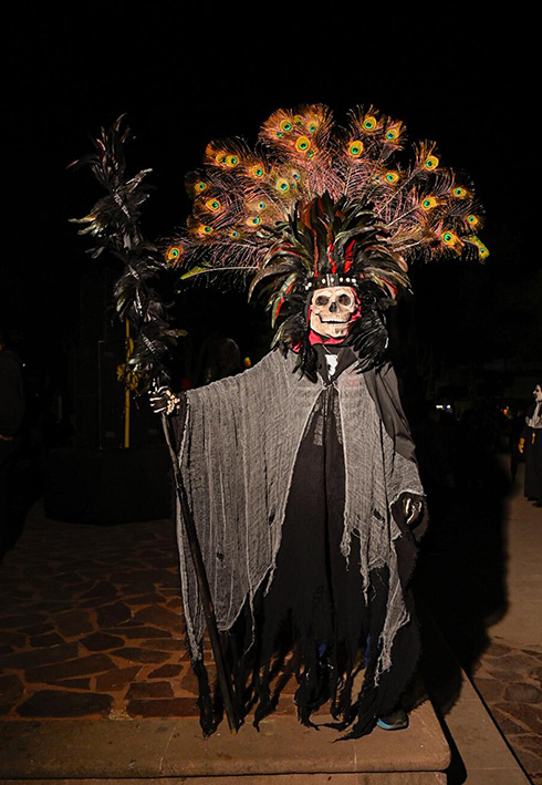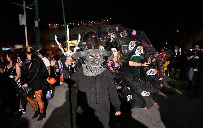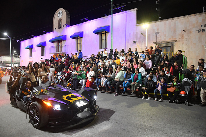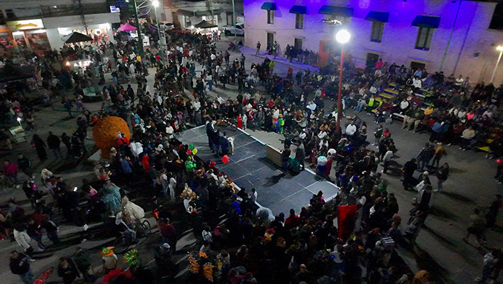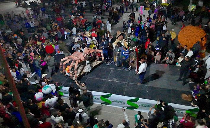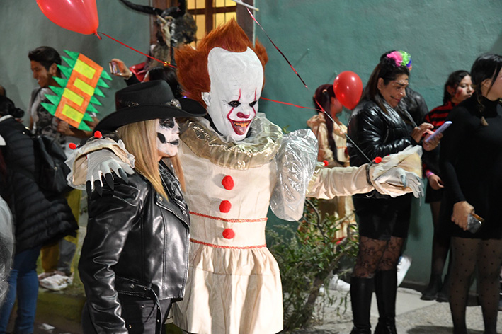 Desde las siete de la noche, el exterior de la Casa de Cultura se llenó de cientos de niños, niñas y personas caracterizadas de carniceros con sierras, seres post-apocalípticos ataviados con trajes de bioseguridad, diablos, zombies, payasos sangrientos, seres sin cabeza o descarnados, brujas, momias, catrines y criaturas terroríficas, que avanzaron lentamente en contingente hacia el Jardín principal, generando asombro y terror entre familias enteras que salieron a disfrutar del espectáculo, algunos con asombro, otros entre sustos y risa.