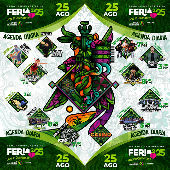 La tarde se llenará de folclor con el Ensamble Folklórico de Zacatecas Tezcatl–Tlalli, que compartirá la riqueza cultural de la entidad invitada, mientras que la Compañía de Danza Folklórica Ek Balam de CECYTE SLP pondrá en alto el talento local con estampas llenas de color y orgullo potosino.