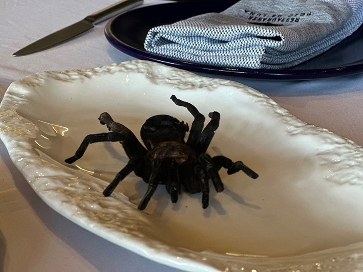 Pero el platillo que más destaca es el taco de tarántula, que cuesta 739 pesos, y se sirve con guacamole, cebolla morada y lechuga fresca, acompañada por supuesto, de una copa de vino tinto reserva de la casa.